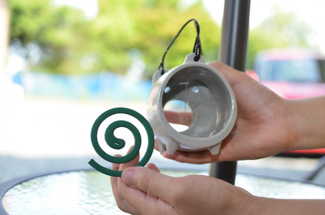 こんにちは。店主の山岡です。 カモシカ商店の人気商品のひとつに、蚊やり豚があります。 蚊やり豚の使い方って割と一般的なのかな〜 なんて思っていたんですが、「蚊やり豚 使い方」で検索してカモシカ商店へ辿り着かれる方が以外と多いので記事にしてみました。もし気に入っていただけたら是非おひとつポチってくださいね♪ 「蚊取り豚」とか「豚の蚊取り線香」なんて呼ばれたりもしますが、「蚊やり豚」が正式名称です。 蚊やり豚にも個性があって 蚊やり豚のシェアは萬古焼(ばんこやき)がほとんどを占め、主に四日市市と菰野町で製造されています。 カモシカ商店では、菰野町の松尾製陶所で製造された蚊やり豚の中から約15種類を販売しています。 菰野町の松尾製陶所が作る蚊やり豚は、ボディがまっすぐで丸みがあるのが特徴です。 ふつうサイズ(17.5×14.5x15cm) ミニサイズ(10x10x10.5cm) すわり豚(17x17x15cm) 蚊やり豚の使い方 今回は手のひらに収まるミニサイズの蚊やり豚で、その使い方をご紹介します。 蚊取り線香をセットする 蚊取り線香と蚊やり豚をご用意ください。 カモシカ商店からご購入いただいた場合、針金が付属しています。 中央からぶら下がっている針金に、蚊取り線香を引っ掛けます。 蚊取り線香をぶら下げることができました。 さあ、いよいよ火を点けます。 バッチリです! これで鬱陶しい蚊ともサヨナラ! ちなみに蚊取り線香は長さ10cmあたり約1時間燃焼します。 中のぐるぐるがチラっと見えるところが可愛いです! 以上です。できましたか? ミニサイズの蚊やり豚の場合 ただし、今回使ったようなミニサイズの蚊やり豚は、蚊取り線香にちょっとしたひと工夫が必要です。市販の蚊取り線香の直径が約11.5cmであるのに対し、蚊やり豚の内径が約9cmなので、そのままだと豚の中に入りません。 そこで、蚊取り線香の外側2巻程度を折って使います。持ち運びやすくて可愛いんですが、ひと手間かけてやらないといけない。 その点、ふつうサイズ(ミニサイズの1.5倍)の蚊やり豚は市販の蚊取り線香をそのまま使えるので便利です。 ※最近は、折らずに使えるミニサイズの蚊取り線香も販売されているそうです(2016年7月28日更新) すわり豚の場合 すわり豚はもっと簡単! 黄色い不燃性のマットの上に、火をつけた蚊取り線香を乗せるだけでOKです! まとめ 蚊やり豚の使い方って、意外にとっても簡単ですよね♪ キャンプやバーベキューで、蚊が寄ってくるよ〜〜なんて悩みにも、蚊やり豚ひとつあれば問題なし。おしゃれな蚊やり豚が一緒なら、話題になるし雰囲気も壊さないのでGOODです。 みなさんも蚊やり豚と一緒に風情ある素敵な夏をお過ごし下さい。